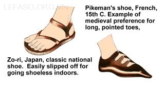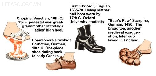 Trong các loại giày kỳ quặc, có kiểu giày Crackow, là loại giày mũi rất nhọn và dài, rất khó đi nếu không muốn nói là không thể đi, và các nhà luật pháp đã phải ra lệnh cấm phát triển nó. Tiếp theo là giày Mũi vịt trong thời kỳ Elizabeth và các nhà luật pháp cũng đã phải quy định chiều rộng tối đa của mũi giày là 51/2 inches. Những nhà sáng tạo vẫn tiếp tục thừa kế và phát huy những mẫu giày kỳ quặc này.