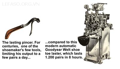 Chúng ta đã có một bước tiến dài từ thời sử dụng gọng kìm – một sự kết hợp đơn giản giữa kẹp và đòn bảy. Trong nhiều thế kỷ, đây là dụng cụ duy nhất của người thợ giày thủ công dùng để tạo dáng cho chiếc dày, với sự hỗ trợ duy nhất của những ngón tay và đinh. Khoảng hơn một thế kỷ trước, một người cố gắng hết sức cũng chỉ làm ra được vài đôi một ngày dài. Ngày nay, với máy Goodyear Welt, có thể sản xuất ra 1.200 đôi chỉ trong 8 giờ làm việc.
