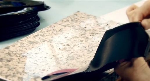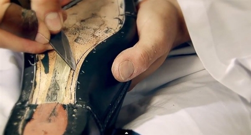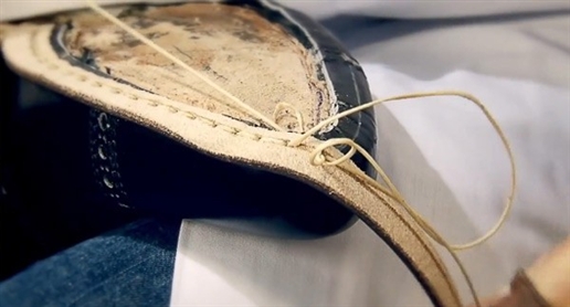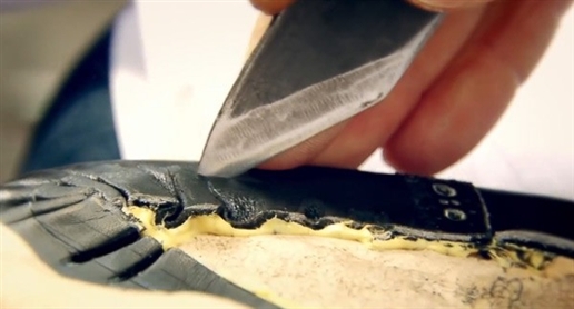 Dùng dao sắc loại bỏ những phần da thừa say khi khâu ốp da vào đế giày.