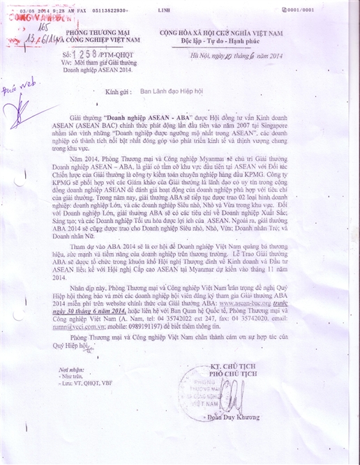 Nhân dịp này, Phòng Thương mại và Công nghiệp Việt Nam (VCCI) mời Quý doanh nghiệp quan tâm đăng ký tham gia giải thưởng ABA 2014 miễn phí trên website chính thức của Giải thưởng ABA: www.asean-bac.org trước ngày 30 tháng 6 năm 2014, hoặc liên hệ với Ban Quan hệ Quốc tế, VCCI (Anh Nam, điện thoại: 04 35742022, ext 247, fax: 04 35742020, email: namn@vcci.com.vn, mobile: 0989191197) để biết thêm thông tin.