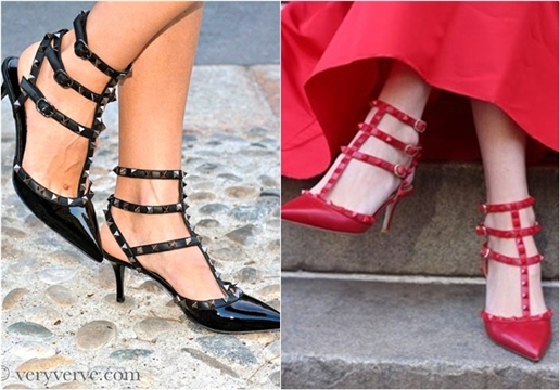 Trong khi các hãng mốt khác đi theo phong cách thể thao thì Valentino vẫn mải mê với những đôi cao gót đinh tán, làm mê hoặc nhiều người đẹp. Cách thiết kế đan dây, bít mũi của mẫu giày này được yêu thích bởi tôn chân, che khuyết điểm hiệu quả.