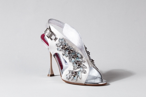 Thiết kế sandals cao gót của Manolo Blahnik pha trộn giữa kiểu dáng hiện đại và họa tiết trang trí nữ tính đậm nét cổ điển.