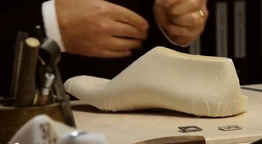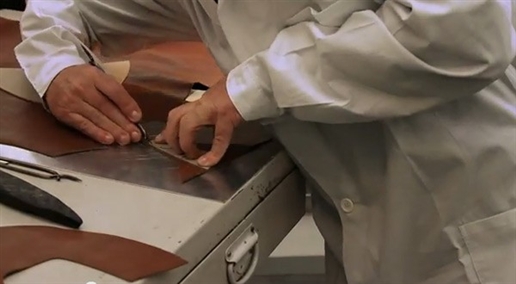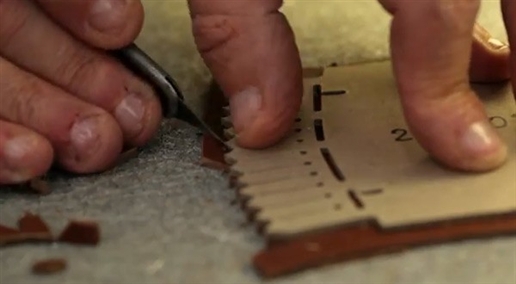 Từ mẫu vẽ trên khuôn chân, những người thợ sẽ đưa ra bản mẫu bằng giấy/bìa cứng và ướm vào các miếng để cắt thành hình. |