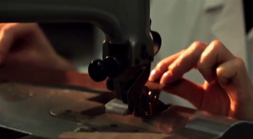 Đưa miếng da qua máy dập lỗ. |