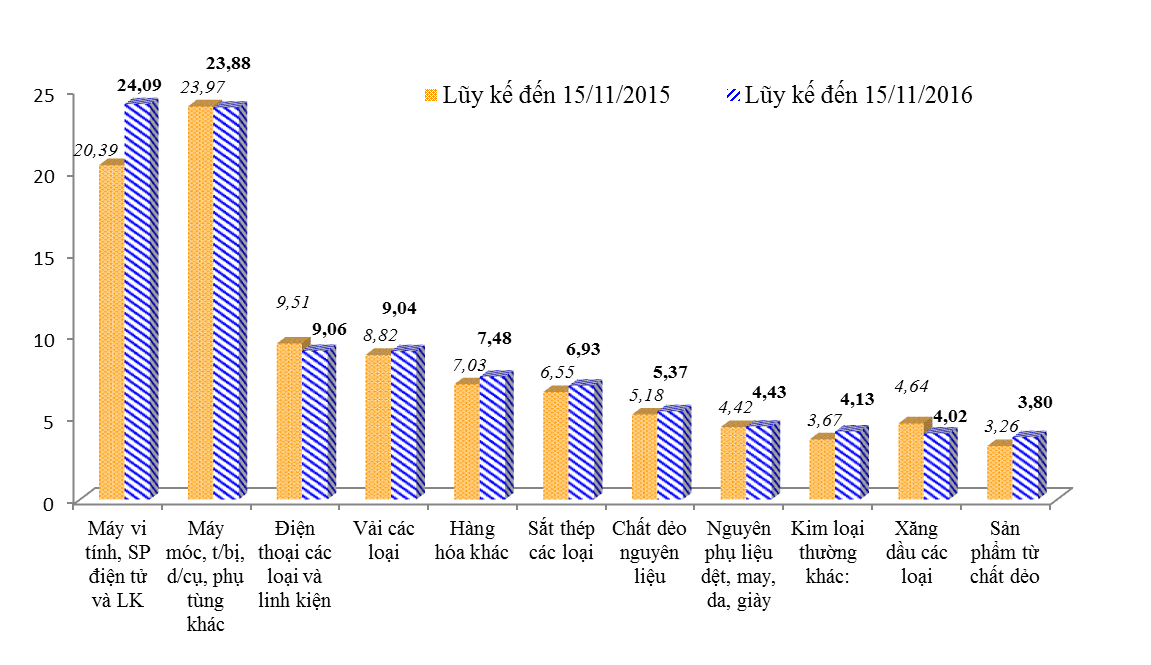 So với nửa cuối tháng 10/2016, nhập khẩu trong nửa đầu tháng 11/2016 tăng/giảm ở một số nhóm hàng sau: máy móc, thiết bị, dụng cụ, phụ tùng khác tăng 10,9% tương ứng tăng 136 triệu USD; chất dẻo nguyên liệu tăng 13,6%, tương ứng tăng 40 triệu USD; kim loại thường khác tăng 16,2%, tương ứng tăng 29 triệu USD. Ở chiều ngược lại, nhóm hàng đậu tương giảm 72,3%, tương ứng giảm 28 triệu USD; hạt điều giảm 37,1%, tương ứng giảm 28 triệu USD; phương tiện vận tải và phụ tùng giảm 53,6%, tương ứng giảm 38 triệu USD; máy vi tính, sản phẩm điện tử và linh kiện giảm 7,1%, tương ứng giảm 99 triệu USD.