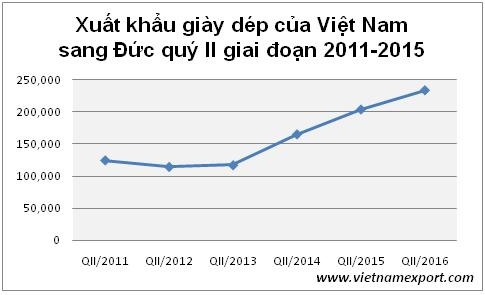 Hiện nay, Việt Nam chiếm thứ 2 về thị phần xuất khẩu giày dép tại Đức, với mức tăng trưởng giai đoạn 2011-2015 là 12%. Kim ngạch xuất khẩu giày dép của Việt Nam quý II hàng năm có xu hướng tăng trưởng ổn định từ năm 2013, với kim ngạch đạt 116,22 triệu USD, tăng 2,26% so với cùng kỳ năm 2012. Quý II năm 2016, kim ngạch đạt 232,43 triệu USD, tăng 12,68% so với quý II năm 2013, đây là mức kim ngạch cao nhất trong cả giai đoạn.