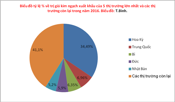 Riêng trong năm 2016, Hoa Kỳ nhập khẩu lượng giày dép từ Việt Nam đạt tổng giá trị kim ngạch gần 4,484 tỷ USD, tăng 10% so với cùng năm 2015. Các thị trường lớn khác là: Trung Quốc đạt kim ngạch 904,9 triệu USD, tăng 20%; Bỉ đạt kim ngạch 825,4 triệu USD, tăng 14%; Đức đạt 764,7 triệu USD, tăng 8,4% ; Nhật Bản đạt 674,9 triệu USD, tăng 12,9%...