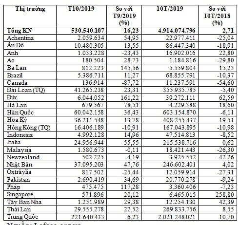 Đứng thứ ba là thị trường Đài Loan (TQ) với 41 triệu USD, chiếm 7,8% trong tổng kim ngạch, tăng 23,31% so với tháng 9/2019 và tăng 9,88% so với cùng tháng năm 2018, nâng tổng kim ngạch từ thị trường này lên hơn 355 triệu USD, giảm 5,4% so với cùng kỳ năm 2018. Sau cùng là Nhật Bản với hơn 37 triệu USD, chiếm 7% trong tổng kim ngạch, tăng 47,76% so với tháng 9/2019 và tăng 29,04% so với cùng tháng năm 2018, nâng tổng kim ngạch từ thị trường này lên 246 triệu USD, tăng 4,02% so với cùng kỳ năm 2018.