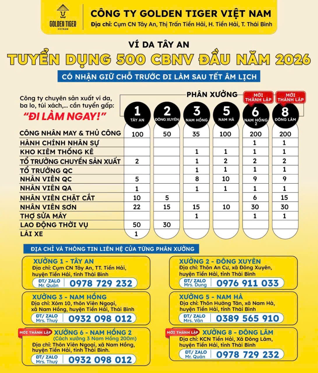 GOLDEN TIGER VIỆT NAM – THÁI BÌNH ĐANG CẦN TUYỂN DỤNG THÊM 500 CBNV CHO 6 XƯỞNG ĐỂ MỞ RỘNG SẢN XUẤT KINH DOANH